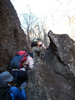 さて、ここから先は裏妙義鎖場ハイライト、ぺがさんが先頭に立ちます。まずはチムニー内の垂直下降。ぺがさん、なおさん、ニシさん、いたさん、滞りなくどんどん降りていきます。降りきってこちらを見上げたぺがさんの姿が小さい。順番待ちしていると「鎖に完全にぶら下がるんじゃなくて、足場にしっかり立つように」となおさんの声。むむ、なるほど。そう心がけて、いざ。…が、気づくとぶら下がっています。次の機会にはもっとスマートに降りたいものです。その後は赤岩、烏帽子岩のトラバース。私は少々遅れ気味だったので、武蔵さんが後ろにいて下さって気分的にとても助かりました。
