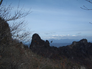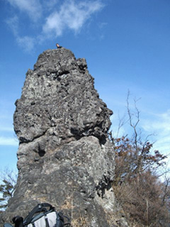 写真で見ていた裏妙義のシンボルともいうべき丁須の頭を実際に見た印象は、思っていたより小さいな、という感じでした。先に来ていた人たちが、岩登り装備で頭に挑戦しています。「思っていたより小さい」というものの、今すでに決して広くはない基部でスカーンとした絶景だというのに、さらにその上のスカーン…、いや、もうここだけで充分です。表妙義の特徴ある稜線、煙?たなびく浅間山、彼方には雪を戴いた上越の山々…と心ゆくまで堪能できました。素晴らしい天気に感謝。