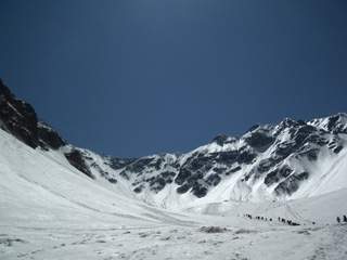 一夜明け、この日も雲ひとつない青空です。6:35に出発。小豆沢を登ります。カールの底から見上げるとかなりの急登。しかし、実際登ってみると登れないほど急な感じはなく、早朝なので雪もよくしまって歩きやすかったです。ただ、半分登ったあたりから渋滞がひどくなり、勾配のきついところで止まるはめになったのには、ちょっと参りましたが。穂高岳山荘のある白出乗越まで登りきって一休み。