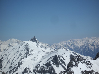 山荘からすぐのところが岩場。アイゼンをつけているので歩きづらいのですが、手をうまく使って、さほど苦労せず登れます。岩場が終わるとやや急な雪壁。雪がしまっているので歩きやすくて助かりました。しかし、このルートは登りと下りが同じ道。すれ違いで渋滞が起こるのがちょっと嫌な感じです。雪壁を抜けたあとは気持ちよく稜線を歩き、奥穂高岳の山頂に到着。快晴で空気も澄み、360度の大展望を満喫しました。北側には槍ヶ岳や白馬岳、南側には乗鞍岳や中央アルプス、さらに南アルプスの山々や八ヶ岳も。
