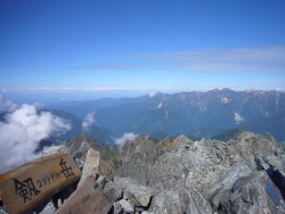 室堂で水をくみ、7時40分出発。ぶらぶら歩くと去年ザックカバーを飛ばされた雷鳥沢。当然見つかるはずもなく、雷鳥沢の登りにかかる。天気はどんより曇り。日差しがなくて登りやすいが、天気予報が晴れだったので、「うーむ、今年もツイてないのかな」と思いつつ、さくっと1時間程で剱御前小屋到着。早くついたので15分ほど休む。時間短縮の為、剱沢へは下りず、剣山荘へとトラバース。山荘横に荷物をデポし、10時25分、最小限のビバーク用品だけ持って剱本峰を目指す。一服剱に10時43分到着。前剱がかなり急峻に見える。一旦下り、登りだすとそれほどでもない。さくっと、11時24分前剱頂上に到着。天気が急速に回復し青空の中、剱本峰がどーーんと見える。ここから再び一旦下って、登り返す。めんどくさいなぁ。鎖場が連続するが特に難しくはない。さすがにカニのタテバイはちょっと緊張。こういう垂直の登りは結構疲れるなぁ。タテバイを登りきり、だらだら登っていくと早月尾根との合流点があり、12時38分頂上到着。室堂から約5時間だった。なんと、祠が無くなっている。残念。記念写真や風景写真をひとしきり撮ると頂上で昼寝する。13時20分に下山にかかる。下山してデポした荷物を回収。剱沢に登り返しテントを張る。その日は眠いのでビールで乾杯し、夕飯を食べて18時には就寝。