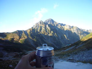 | 五龍、鹿島槍、爺ヶ岳。手前は源次郎尾根 | ビールで乾杯! |
