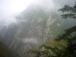 予想した天気では朝9時あたりに寒冷前線が通過するはずだ。雨は確実なので、ゆっくり帰ろうと思っていたのだが前日の驚愕の事実のため、朝3時起きになる。雨はかなりの本気降りで憂鬱な気分。しょうがなく朝5時出発。最初は登りが続きうんざりだ。かなり登ってからやっと水平歩道にはいる。阿曽原にいた人はみんな5時前後に出発しているのでところどころで渋滞につかまる。水平歩道は文字通り水平なので、我々のペースは早足、時には走ったりする。所々道幅が狭く落ちたら即死のような所があるが、場所によっては奥多摩を歩いているような錯覚に陥る場所もある。そういう所で走って渋滞をゴボウ抜き。雨が激しく黒部川は濁流と化している。水平歩道は何回も枝沢を渡渉するような所が何回もあり、そこでは修行僧のように滝に打たれながら通過しなければならない。当然ながら全身びしょぬれ。いかに雨具に防水スプレーをかけたりスパッツをつけても滝にうたれたらひとたまりもない。それでもしばらく靴の中は乾いていたが、折尾谷のトンネルの中はひざ下まで水がありジャボジャボ歩いていかないといけない。この時点でどんな靴を履いていても濡れないということはありえない。むしろ重登山靴をはいていたら重たくなってしまうだろう。こんな感じでひたすら欅平を目指すわけだが、当然ながら不快さ満点。早く宇奈月で温泉に入りたい一心でハイペースで急ぐ。大太鼓では奥鐘山西壁が見えてくる。I氏は数年前はこの壁によく通ったそうだ。志合谷の寒い150mのトンネルを過ぎ、ひたすら、ひたすら水平歩道を歩くとその西壁が正面に見えてくる。残念ながら雨で天気が悪いためにガスガスでよく見えない。相変わらず岩壁を雨水がシャワーのように降り注ぎ、頭のてっぺんから足のつま先まですぶ濡れ状態。この状態で気温が下がったら低体温症になりそうだ。ただ、水平の為いくら歩いても疲れないし、止まると寒いので歩き続けた。結局欅平まで4時間20分休憩なしで歩き通した。