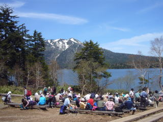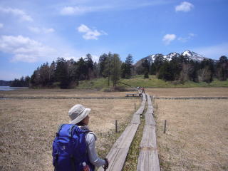 長蔵小屋から沼尻までは人がすくなく快適なトレッキングだ。今週あたりが人出のピークだと聞いていたのだが全然気にすることはなかった。時々前後の木道に誰もいなくなり360度の景色を我々だけで独占したような気分になる。それもつかの間、沼尻休憩所は案の定混んでいて、木道に寝転がっている人もいる始末。沼尻から見晴は林間の道で所々雪が残っていた。行き交う人はめっきり減る。