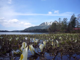 ここから尾瀬沼をぐるっと一周して見晴に行くことにする。まずは長蔵小屋を目指して歩いていくと、あったあった、水芭蕉だ。群生しておりバックは尾瀬沼と燧ケ岳という絶好のポイント。写真を撮りまくった。