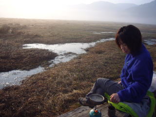 朝は3時半頃起きる。朝の尾瀬を散歩したいので、妻を起こして散歩に行く。ザックには水、ガス、朝ご飯。朝もやの中の尾瀬ヶ原を行き、ベンチでコーヒーを沸かして朝ご飯にする。ちょうど燧ケ岳から太陽が昇ってきて、全てのものが黄金色になる。