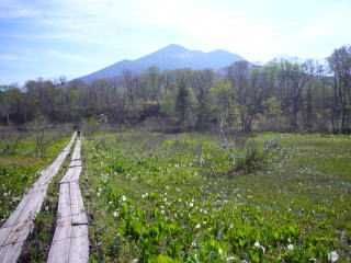 東北自動車道と日光有料道路を乗り継ぎ、国道120号を使って戸倉に入る。戸倉駐車場はすでに満車でスキー場の駐車場にまわされてしまう。駐車場のバス停からバスで大清水に入ろうとしていたのだが予定がくるってしまった。しょうがないのでタクシーで大清水に入る。3750円也。大清水からはいる入山者は少ない。尾瀬沼まで2時間以上かかり、しかも最初の一時間はつまらない林道歩きだからだ。しかし今回はこれが正解。なぜなら、タクシーの運ちゃんによると鳩待峠は大量の入山者で身動きできない程混んでいるらしいからだ。一ノ瀬休憩所で一服し登山道にはいると最初は渓流ぞいの道を気持ちよく歩けるが、暫らく行くと登り調子になる。山登りに慣れてない妻は、疲れて顔色が悪い。時間はあるのでゆっくり行く。登るにつれ木道に残雪が残っている場所があらわれてくる。妻は突然元気になりおおはしゃぎだが、滑らないようにと注意する。