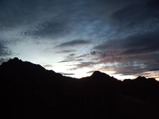 朝2:30起床。すばやく朝食をとり、テントを撤収し、3:30にスタートします。真っ暗な中ヘッデンをつけ、少しガレた道を、慎重に足を運びます。それでも、独標、ピラミッドピークと過ぎるうちに、少しずつ周りが明るくなっていきました。前方にこれから向かう西穂のピークが見え、周囲には笠ヶ岳、乗鞍、白山、中央、南アルプスの山々…。夏とは思えない、冷たい空気の中を、一歩ずつ歩いていきます。