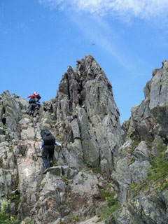 かなり長く歩き、そろそろ半分進んだかと思ったら、ピークに「間ノ岳」と岩にペンキで文字が。地図と見比べ、まだこんなに進んでいないのか…と、みんなでガックリきます。この先も、鎖のある垂直な岩場がいくつも登場します。こういう斜面は登りより下りのほうが緊張します。たっぷり登って、たっぷり下る…を何度も何度も繰り返します。