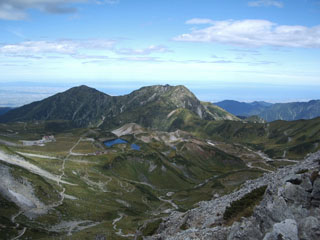 暗くなるに従い「できればトイレに行かずに寝てしまいたい」と切望する程度にもりもり降ってきた昨日の雨は、夜が明ける前に止み、風が強いのが幸いしてテントも乾き、よって朝からご機嫌。今日は最短ルートで降りるだけ。御前小舎前から行ける小ピークへ道草して劔御前の岩峰を眺め、下ってからは大回りして地獄谷散策、とのんびりしても9時過ぎのトロリ−バスに乗ることができて、混雑知らずの帰り道。帰りのあずさでつついた、ニシノさんがケーブルの駅(だったか?)で購入したホタルイカの沖漬けは絶品だった。