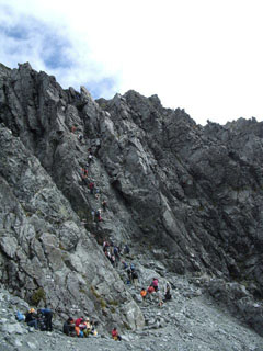 昼から崩れるということだったのでなるべく早くに出発したのだが、高い雲は出ているものの山も海もスッキリ見渡せる。日差しが結構痛い。前劔の辺りだったか、ガレている所でガスが出ていたら分かりにくい感じの所があったが、2人であっちだそっちだとやりながら順調に進む。タテバイの下までほとんど人込みにまみれることなく到着し、すぐ先にいるのはトップのガイドさんらしき人が確保しながら登っているグループだけで、ココでどれだけ待つことになるのか?と思っていたので嬉しい肩すかしだ。実は、ここが入口?でまだ先に長くてものすごい垂壁があるのだと思っていたのだが、登ってからどうやら今のがタテバイだった、と判り私は胸を撫で下ろした。