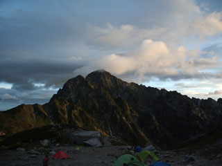 大汝山〜富士ノ折立の間に通り雨に遭うが、それもすぐに止みホッとする(それでも黒部湖、後立の展望は楽しむことができた)。前の人も後ろの人も、別山をことごとく巻いて行ってしまったが、私たちは当然とばかりに登る。お向かいに剱がドーンと見える別山の山頂は広々として、静かで気持ちよい場所だ。またパラッと来そうになってきた所で剱沢キャンプ場に下ることにする。