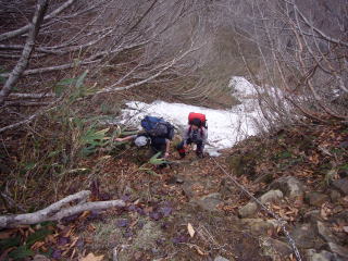 【28日】26日に開通したばかりの林道の終点、大日杉小屋から出発。登山口からしばらく雪がなく、夏道を進みます。しかし人は最近入っていないらしく、道が荒れていて判りにくい。赤布も1、2箇所あるだけでした。