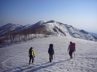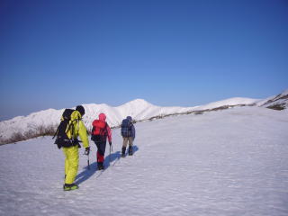 まぶしいばかりの快晴。荷物も軽ければ足も軽い。切合小屋に突き上げる沢ルートは、上部が少し雪崩れています。隣の尾根から稜線へ出ると、ペナント発見。というわけで切合小屋にて、ようやく自分達以外の人間と遭遇しました。川入から入山した男性3名。他にも早朝出発した人がいたそうで、切合小屋からは飯豊本山に向かってトレースがついていました。トレースがあると迷いなく足を踏み出せるようになり、元気を取り戻す自分。…まだまだ道は遠いです。