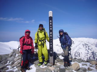 それでも到着した山頂は、360°、見渡す限りの大展望。気持ちが一気に高揚します。取り敢えず全員でがっちり握手!西には大日岳へと続く、白く輝く広い稜線が見下ろせ…、さてこれから、どうしよう?「どうするの?」と6つの目に見つめられてタジタジとなる疑似リーダー。あまりにも天気が良いので大日岳には行けないにしても御西岳まで稜線散歩をしたい気がしたのですが、風はいまだ強いしどうか?というアドバイスもあり後ろ髪引かれつつここで戻ることにしました。また今度。(は秋に超軽量化を心がけ飯豊温泉から南下?)…などと思いながら未練たらしく後ろからゆっくりと山頂を後にします。本山小屋の冬季入口から中に入り、お茶を湧かして長めの休憩を取ってから切合小屋のトイレ目指して出発。避難小屋というと汚いと思っていたのですが、とても綺麗でした。ただ30センチばかりの間隔で数字がふってある板の間…、トップシーズンには、泊まりたくない場所に変貌するに違いありません。孝師匠が後ろから見ていてくれる中、御秘所の下りを終えるとやっと気が楽になりました。本日遭遇の人間4人目、途中までスキーで登ってきたらしい単独の男性とすれ違う。切合小屋まで自由に膝にも足首にも優しい雪の大斜面を気持ちよく下ります。テントに戻ったら今度は本物のビールで登頂祝い→大宴会へ移行です。写真を撮りに外へ。戻っては飲み。復路切合小屋でわずかな間凪いだ風は、治まるかと思いきやビュービュー夜通し吹き続けていました。この幕営地は大正解、でありました。