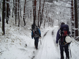 労苦からの開放感。それが充実感に昇華するには下山路が意外によくない。へっぴり腰と後ろ向きで慎重に下りていく。雪崩が心配な中岳沢は駆け下りた。出発する頃、棟梁と親方が「(当初下山ルートに使う予定だった)御小屋尾根はトレースがなく時間がかかるから、行者小屋に下山」と判断していた。この話のとき、ニシノは内心狂喜していたという。登攀装備をはずし、口数も少なく美濃戸口へ歩いていった。