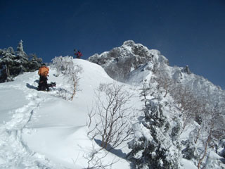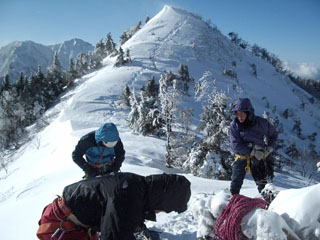 | 阿弥陀岳の岩峰 | アイゼンと登攀具を装着 |
