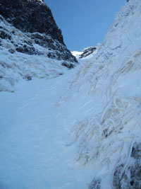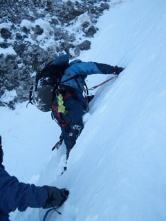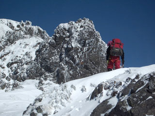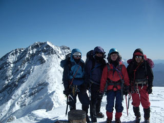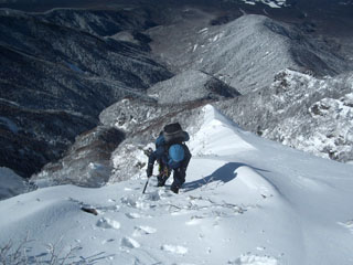 核心部のP3。岩稜のルンゼも雪に埋もれ雪壁登攀となった。確保するにも支点がとれないのでノーザイルで行動。足を滑らせたらどこまでも滑っていくだろう。緊張を強いられる雪面を、棟梁がルートを確実に伸ばしていく。替わった親方もリズミカルに小刻みにトレースを作っていく。細長くのびる雪壁が真っ青な空に突き上げている。無言でそれに挑んでいく。セカンドのニシノは、そのトレースをぶっ壊し、ステップを必死に作りながら追っていく。激しい息遣いを繰り返し、それでも頑張っている。ラストの部長は安定した足跡を律儀にたどるが、それでも足は重くスピードが出ない。緊張の連続に冷や汗とアドレナリンが噴き出し、喉はカラカラ、何度も生唾を飲み込み肩で息をつく。這々の体で核心部をクリアする。