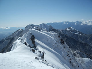 P4なのか、P5なのかも分からないまま、棟梁についていくと平らな丸い雪原にひょいと出る。モンブランのピークに似ていた。14年前、スイス・イタリア国境の山頂で職場の同僚と抱き合い涙したことを思い出す。ぐっときて隊長に握手を求めていった。阿弥陀岳南稜。自分が伸ばしてきた苦闘のトレースが愛おしく見える。