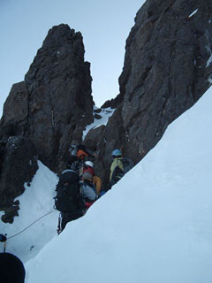 3P目:あつこリード。このピッチは平坦で簡単だからとのことで、リードをさせていただいた。確かに難しくなく、傾斜の緩い雪稜をさくさく歩いていく。しかし、途中でランニングを取る際、慣れないため逆クリップにならないようにするのに時間がかかった。雪稜の終点、4P目の岩場の下までもう少しというところで、残り3mの声が聞こえる。おそるおそる歩を進め、どうにか支点に間に合うが、先行者がいるため足元の支点しか使えない。このためビレーをするのに勝手が悪く、ロープをなかなか引けずにニシノさんに迷惑をかけてしまった。ここでは後続パーティーがコンテで歩いていた。