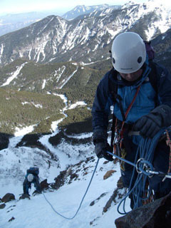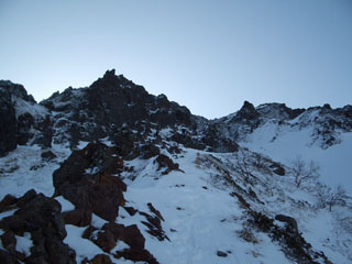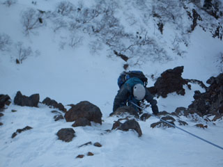 7P目:深沢さんリード。岩を越えて右に進む、声が届きにくいピッチ。深沢さん−ニシノさん−あつこの順で登ったのだが、深沢さんのビレー中にロープが絡まり、ニシノさん・あつこが登り始めるまでに時間がかかってしまった。声が届かないため深沢さんに状況を伝えることができず、寒い中やきもきさせてしまったことと思う。ロープは完全に絡まっており、苦闘の挙句、ほどくためにはハーネスから外すしかないという結論に達するが、足場が悪く危険なため、岩場上の安定した場所に行ってからほどこうということになる。そのためニシノさんはロープが絡まった状態で登り始めたのだが、絡まった場所が悪く、岩に取り付いてすぐのところで先に進めなくなってしまった。上からロープを引かれているため、元の場所に戻ることもできず、やむを得ずその場でハーネスからロープをはずす事態となり、肝を冷やした。また、岩場には浮石が少しあり、後続パーティーがいたため気をつかった。さんざんお待たせした深沢さんと合流。深沢さんは稜線の岩角でビレイしていた。