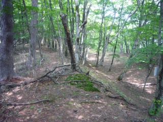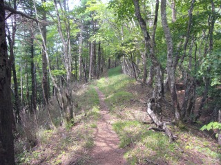 | 木漏れ日の中をひたすら進む | 稜線上の道(正面)ではなく秩父側(右)をまくのが本線らしい。そちらにも明瞭なふみ跡がある |