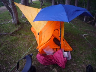 1)軽量化の為ツェルトにしてみたが、他の部分でもっと軽量化できると思う。特にエアマットはいらないかもしれない。風雨対策にテントのグランドシートを持ってきたが、これはよかったが、張り方をもっと研究する必要がある。