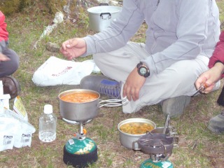 さて、雲取隊は到着しているかなぁと思いながら、奥多摩小屋に向かう。下りなのでラクだ。2時過ぎに奥多摩小屋に着くと、雲取隊はまだ到着してなかった。あれーおかしいなぁ、と思い、もしかして中止になってないよなぁ、と携帯で掲示板を確認しようとしたが、電波が入らない。うーん、どうしようかなぁ、夜に雨が降りそうだし、鷹ノ巣避難小屋まで降りようかなぁ、あー今の時間なら石尾根を降りられるかなぁ。などと思っていると、雲取隊が到着。無事ケッチボーできた。よかったよかった。木の下にツェルトを張り、「お疲れ様ー」とビールで乾杯!ああうまい。つまみを供出しあい、自前の酒を飲んだり、カトさんのマッカランを頂いたり、楽しい宴会で盛り上がる。タニグチさんのフォアグラペーストがうまい! 雲取隊はヨシさん食当で豪華な夕食だ。私は乾燥食料のチーズリゾットとカレーピラフでおしまい。テントに移ってカトさんのロープ実習が始まるが、私は眠くてあまり集中できなかった。ごめんなさい。8時半にお開きし、自分のツェルトに移り、歯を磨いてシュラフカバーに入るとすぐ寝入ってしまった。