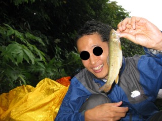ここからが核心部。宴会で盛り上がったことではない。ペガさんがイワナをゲットしたことだ。テンバを設営し夕食の準備をしていたところ先行していた群馬県大田山岳会の二人組みがゲットした大きなイワナ3匹を自慢げに披露するので、ペガさん俄然やる気になってイワナ釣りに挑戦する。誰もイワナに期待してない。そのうちおけらで帰ってくるだろうと宴会の用意をして待っているとやおら25cmほどの魚を手に帰ってくる。見事イワナ1匹を釣上げる。全員拍手と記念撮影。正にサプライズだ。小雨が降っていたが慌てて焚き火の用意をしようとするが適当な木がない。隣の大田山岳会は焚き木の煙は出るが火がつかない、あきらめてテントに引っ込む。貴重な1匹のイワナは笹田総料理長(?)の腕前で吸い物にする。こんなうまい吸い物を口にしたことがない。私が持参した自慢のささみ燻製は影が薄い。隣の大田山岳会からはイワナの刺身の差し入れがある。ほんの小さな肉片だがこれが絶品。感謝、感謝。いたさんがお返しを届ける。共同生活の原点がここにあると思うのだが、隣組感覚は山中のみか?