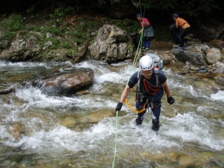 | 快適な遡行 | 魚止めの滝 右側を登るが水が流れているためザイルを出す。 |