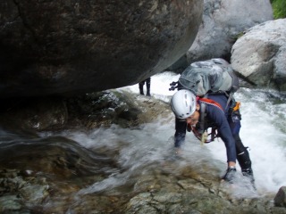 魚止めの滝でロープを出してもらう。コケでぬめる。大きな滝はここで終わりかと思ったらまだ先にあり、巻こうとしたら笹田Lが右岸の壁をへつりながら「手がかり、足がかりはあるから簡単だ、大丈夫なので登って」と手招きする。厳しい壁だったが、ロープなしで何とか通過。途中、はぎちゃん、お風呂気分でたっぷりと2度も壺につかる。
