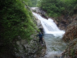 遡行開始からすぐに大きな釜を持つ4、5mの滝を左手から越える。これから先は沢幅いっぱいに広がるナメと滝が目を楽しませてくれる。ある滝では、ペガさんと私が左手を高巻いている間に他のメンバーは滝壺を胸までつかり右壁をやすやすと越えている。慌てて戻り後続する。