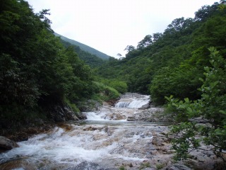 関越自動車道は高速料金1,000円効果と故障車で渋滞。花園ICで一般道に下りるが、ナビの最短時間ルートは高速道路を指示しているので再度花園ICから関越に入ると流れが良くなっている。宝川左岸の林道車止めG到着10:50。ここから林道と登山道を歩き2時間で渡渉点。アップダウンの多い細い登山道と時々日が射す思わぬ天候に吹き出た汗が川の冷気で一気に引っ込む。宝川は連日の雨で水量は多いらしく、渡渉点の流れは速い。沢靴などを装着しロープを出して左岸から右岸に渡渉する。笹田Lが長い流木を流れの1/3程に渡し水流を弱めてくれる。それでも流れの抵抗はかなりある。いよいよ沢登りの開始だ。ペガさんが先導し的確なルートファイティング。最初の滝は、滝つぼに腰までつかり超える。緩やかな浅瀬をしばらく行くとウツボギ沢出合の広川原に出る。ここから本格的な遡行開始。大きな石を渡り歩き、滝は左岸・右岸の厳しい崖をへっぴり腰で通過する。幾つ目の滝か記憶にないが、広川原をすぎた7m滝は笹田Lを除き右手より高巻く。この高巻き道は田んぼを歩くがごときで靴はどろどろ。やっと幕場の大石沢出合に着く。左岸の山の斜面は草地で明るく広いが勾配があるので右岸の低地の先着パーティの隣にテントを張る。笹田L、斜面上部の木にロープを設定し万が一に備える。