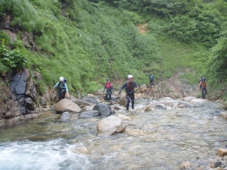 4時起床。はぎちゃん特製の油揚、ちくわほか具沢山のラーメンを美味しくいただく。5時過ぎ笹田L指導のもとハンマーでハーケン打ちの練習。岩の割れ目の見極め、打ち込みの音による判断、外す要領など教わる。本日はナルミズ沢右股を詰め、天国と言われる草原、朝日岳を経て大石沢出合に戻る予定。必要なものだけを持ち5:45スタート。