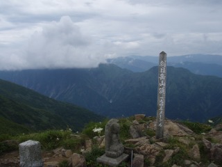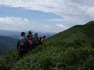 源流地点から稜線まで熊笹の中を泳ぐがごとく急登する。稜線で靴を履き替える。ジャンクションピークまでも滑る熊笹に悩まされる。JPから朝日岳までは気持ちよい稜線歩き。