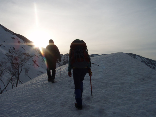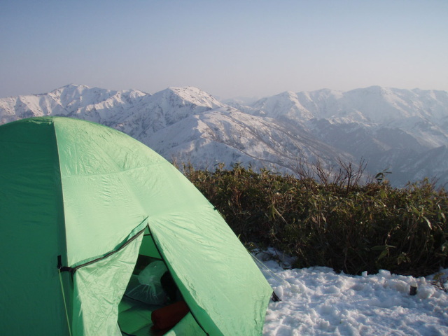 日がかげり、外で宴会するにはさすがに寒い。フリースやジャンパーをはおって、グビグビ、あふあふ。日向山は5人の北稜衆に完全に占領された。我らと前後して歩いてきた中年カップルは、気を利かして少し先の生姜平に幕営している。