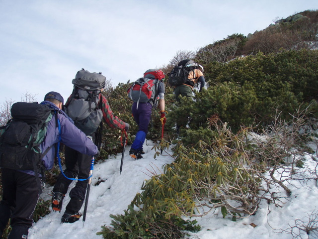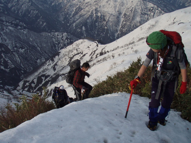 それにしてもここまでの道のりは辛かった。急登途中でつりしは重荷に耐えかね足がつりそうになり「アミノバイタル!」と青い顔でわめいていた。もの静かに歩いていたカラフルしらこも心の中で「クソ、なんでこんな辛いところに来てしまったんだろう」と毒づいていたという。下山するときには飛ばし過ぎたしらこのアイゼン歩行をなおが注意していたが、この登りでは誰もが無口になっていた。